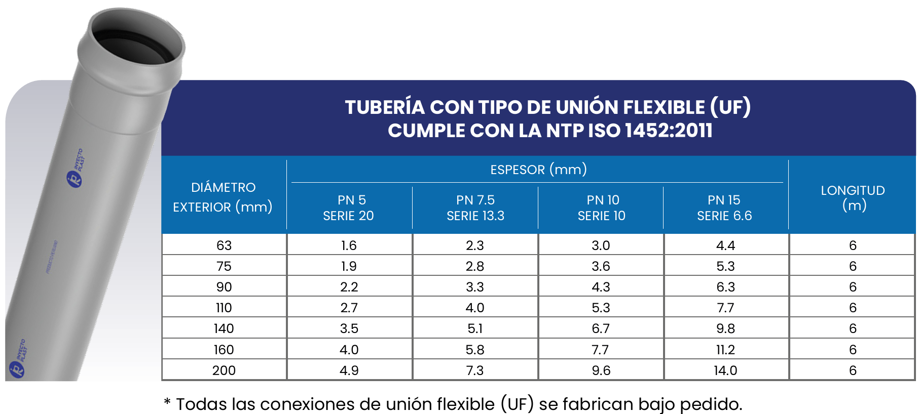 El Tubo de Agua Fría – Tipo de Unión Flexible (UF) de Inyectoplast está diseñado para la conducción de agua fría de manera eficiente y segura, garantizando una instalación rápida y resistente. Su estructura flexible permite adaptarse fácilmente a diversas configuraciones y ajustes en el sistema de distribución de agua, minimizando riesgos de fracturas o fisuras. Con un rendimiento óptimo, este tubo es ideal para mantener la calidad del agua, evitando alteraciones en su sabor y olor. Además, cumple con la Norma de Fabricación NTP ISO 1452:2011, asegurando una alta calidad en su fabricación y durabilidad.