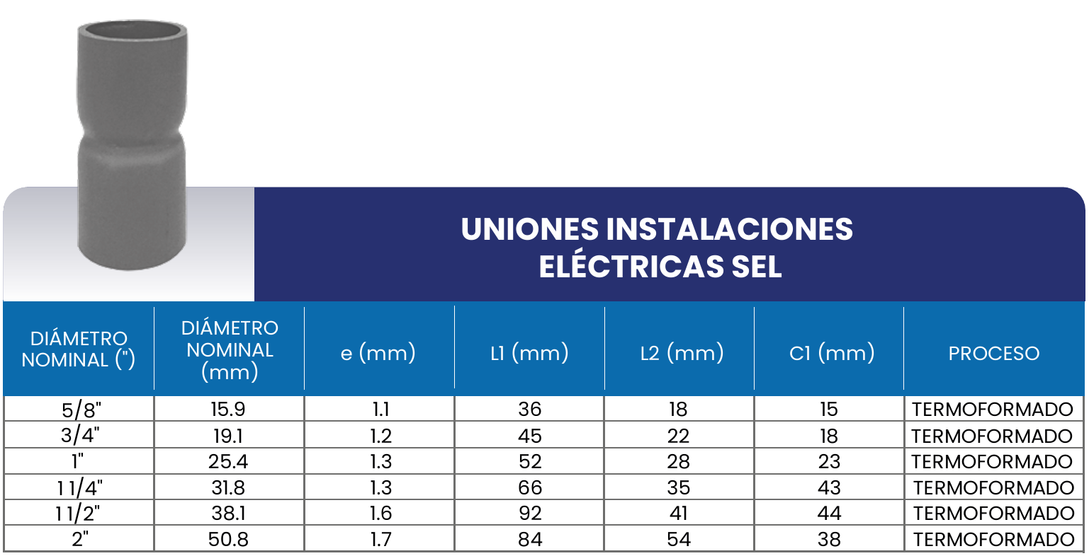 Las Uniones para Instalaciones Eléctricas SEL de Inyectoplast están diseñadas para garantizar una conexión segura y eficiente en sistemas eléctricos. Fabricadas con materiales de alta calidad, estas uniones ofrecen resistencia a la corrosión y aseguran una instalación duradera y confiable. Son ideales para aplicaciones residenciales y comerciales, cumpliendo con las normativas de seguridad eléctrica y proporcionando un rendimiento estable en instalaciones eléctricas.