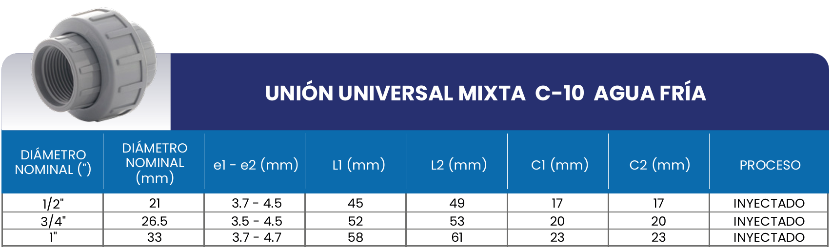 La Unión Universal Mixta C-10 para Agua Fría de Inyectoplast es una pieza de conexión versátil y duradera, ideal para sistemas de conducción de agua fría. Su diseño universal permite adaptarse a diferentes tipos de tuberías, garantizando una instalación segura y sin fugas. Fabricada con materiales de alta calidad, la unión es resistente a la presión y a la corrosión, asegurando un flujo constante de agua. Esta solución es perfecta para aplicaciones residenciales y comerciales, cumpliendo con las normativas de fabricación y ofreciendo una opción confiable y de larga duración en la distribución de agua fría.